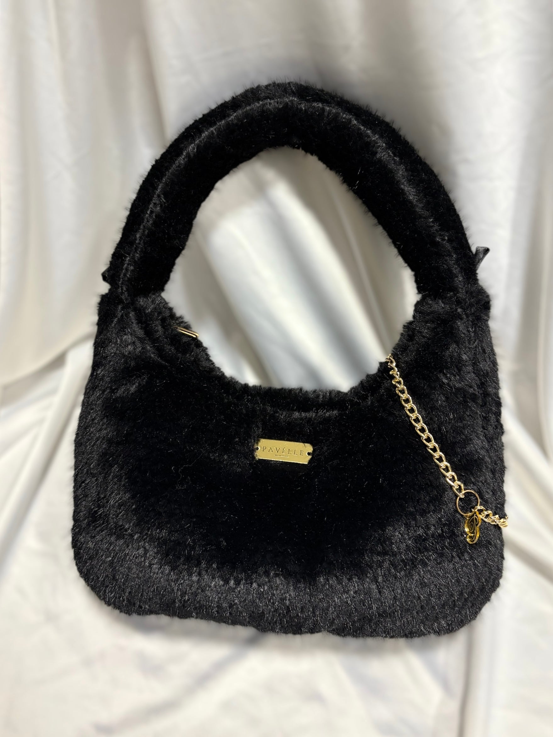 Черна пухена чанта от висококачествена имитация на косъм, с елегантна златна верижка и мек, луксозен силует. ✨