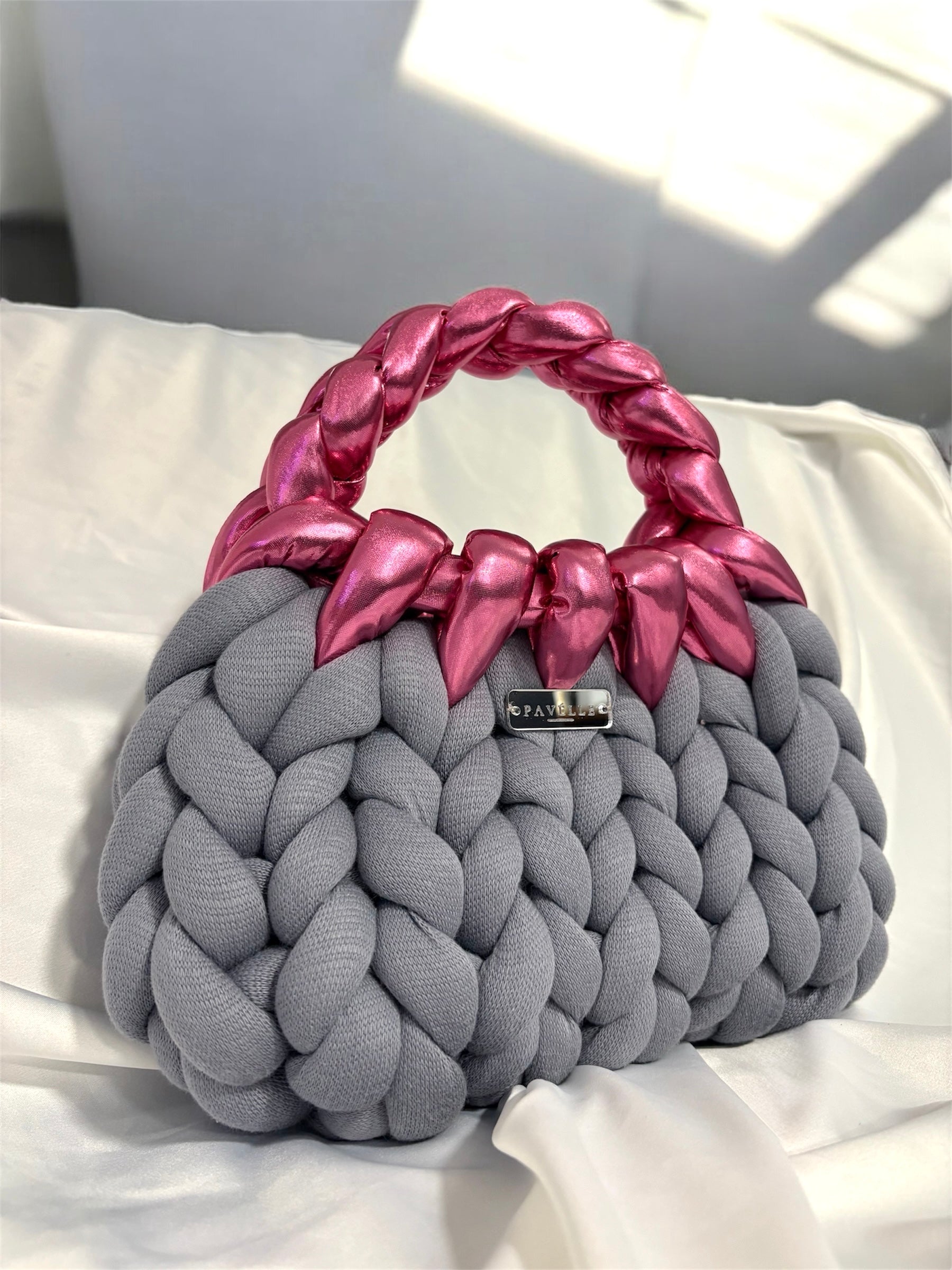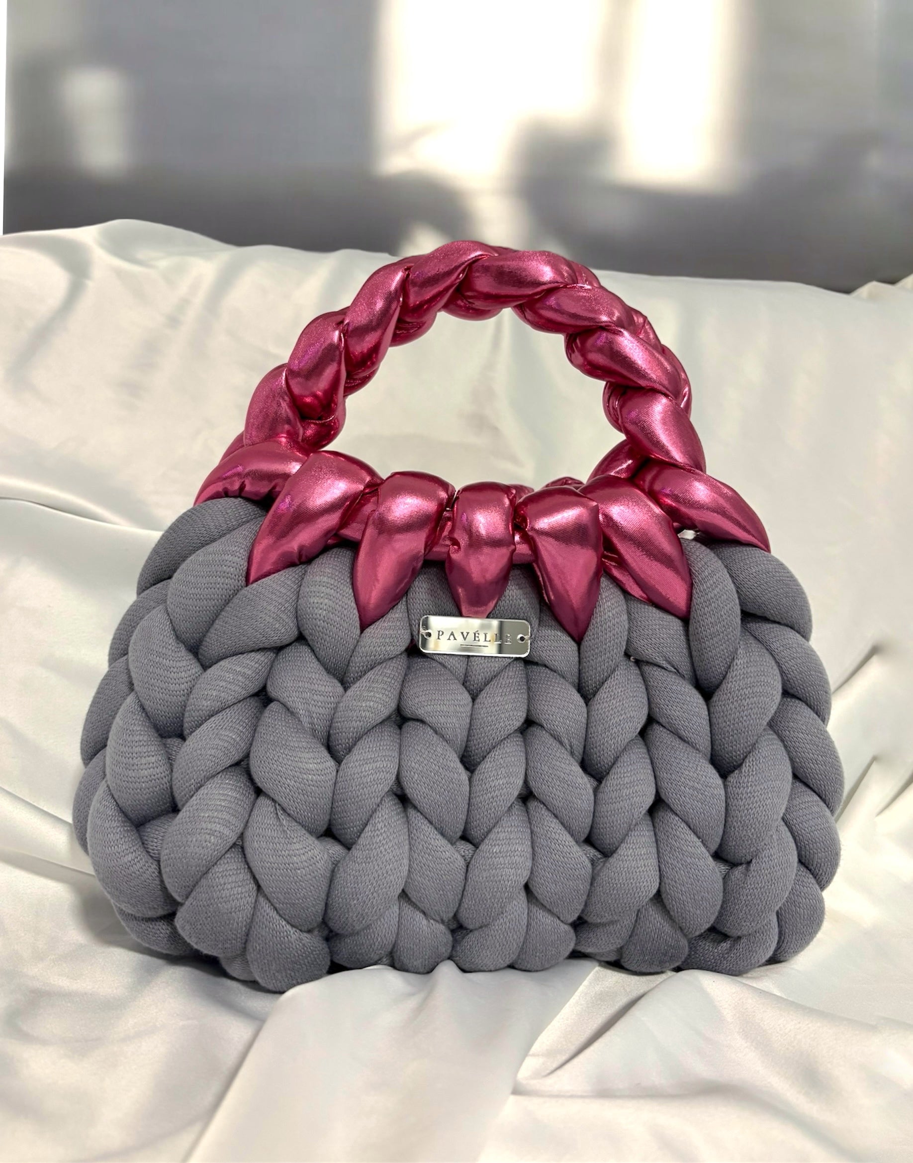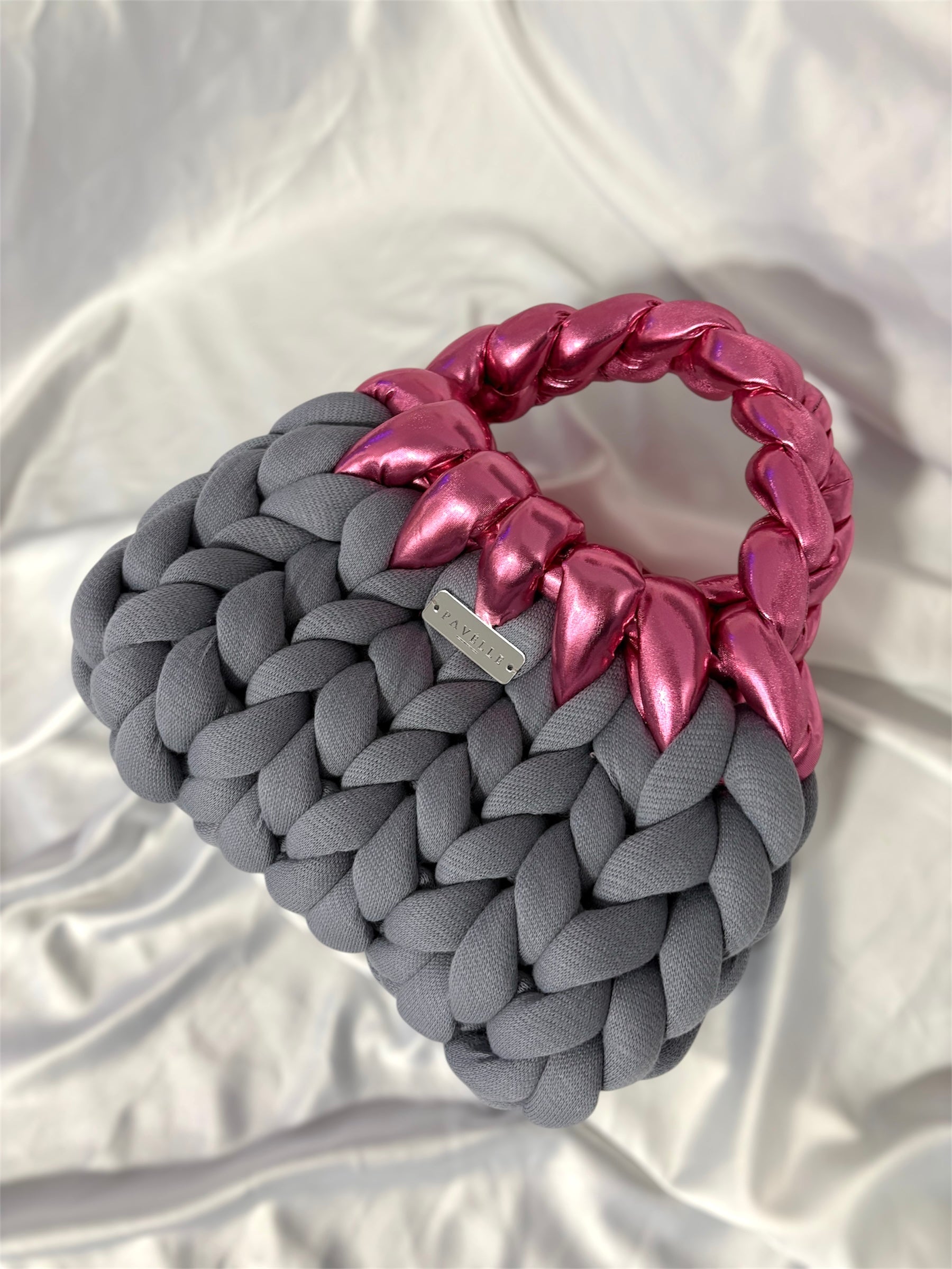Ръчно изработена от меко плетиво в графитено сиво, съчетано с металик розово, тази чанта е създадена за жената, която умее да бъде едновременно нежна и силна.