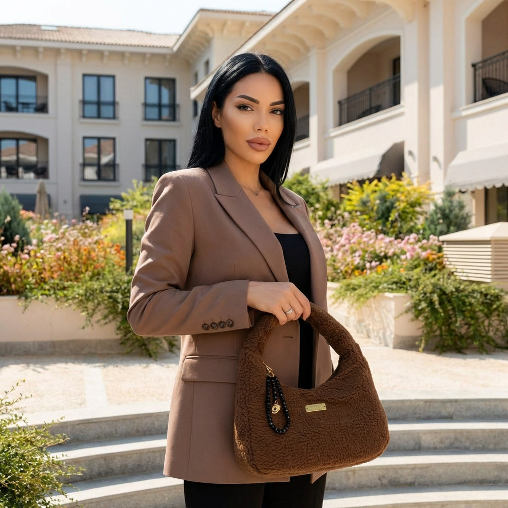 Чантата е изработена от висококачествен каракул, който ѝ придава уникална текстура, уютен обем и усещане за премиум качество. Вътрешната страна е внимателно подплатена с черен сатен, осигуряващ гладко и елегантно усещане при всяко отваряне.